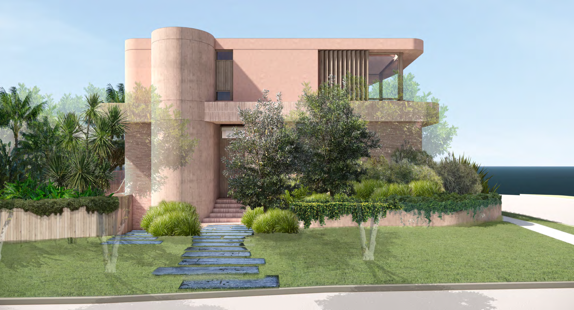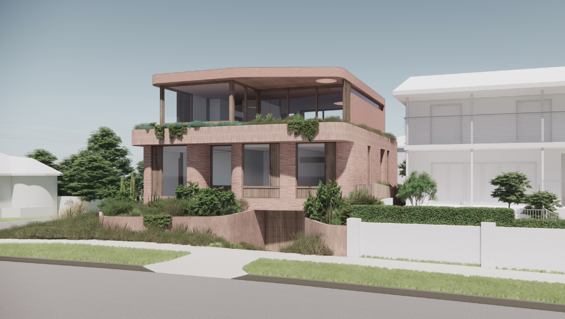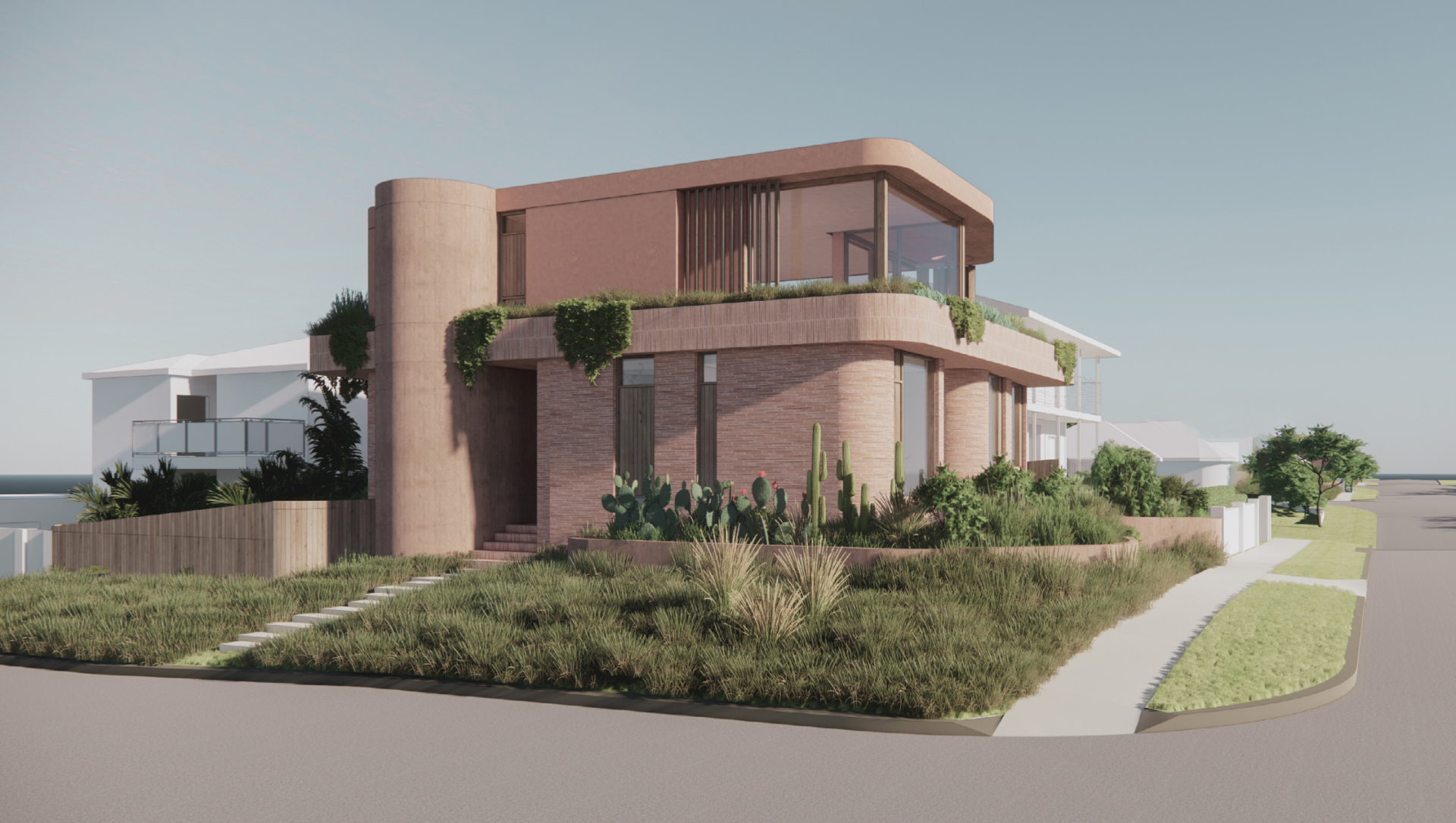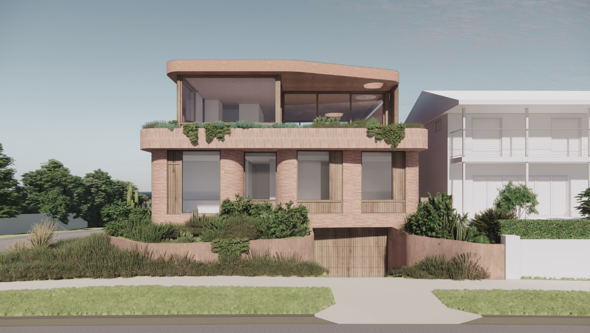 Currently under construction by Rose Construction, this home brings a warm, contemporary presence to its coastal streetscape. Curved brickwork, soft render tones and expansive glazing work together to create a calm, grounded aesthetic, opening the upper level to natural light and ocean breezes.
